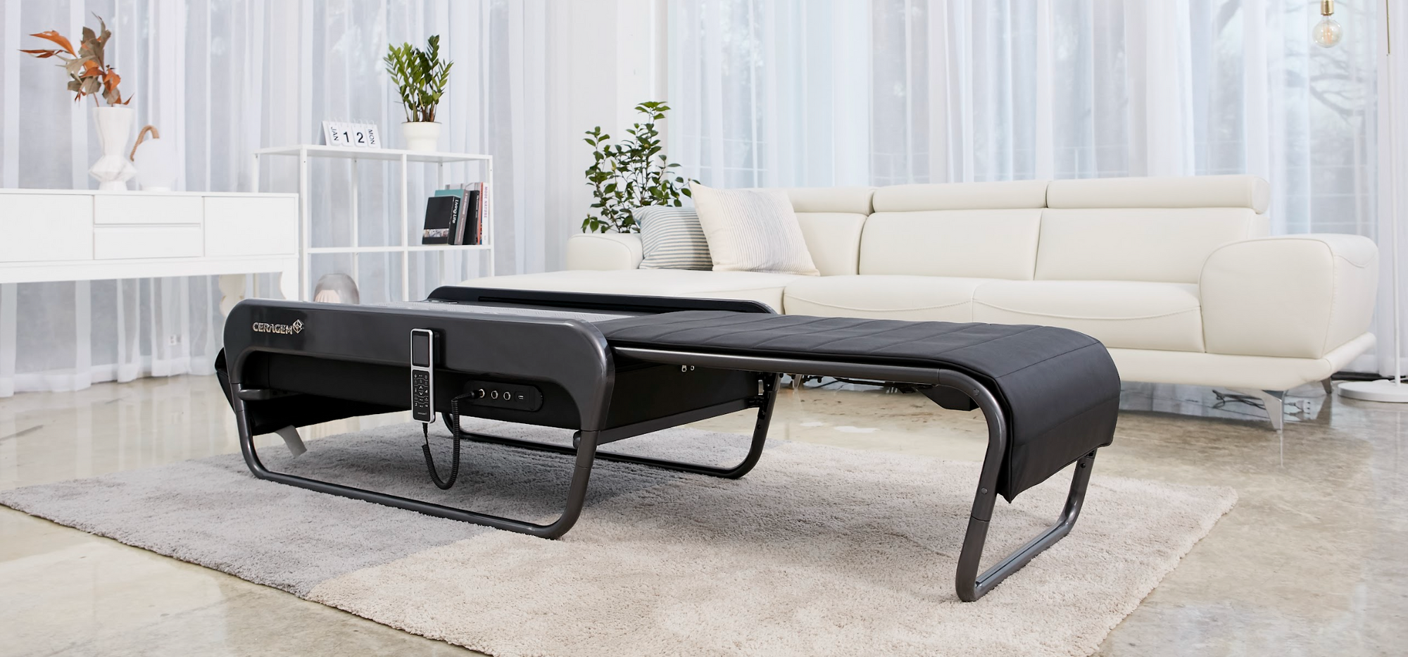 The patented “slide-away” function converts your Ceragem Wellness Thermal Massager from a full-sized massage bed to a discreet heated ottoman or compact couch. Its sleek and sophisticated design makes it a stylish addition to any room in your home